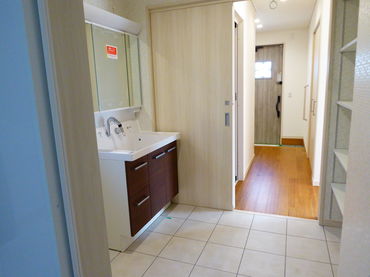 玄関からトイレ、洗面所、浴室へと一直線に並ぶ動線は、スムーズな生活をサポートし、将来を見据えた住みやすさを追求しています。