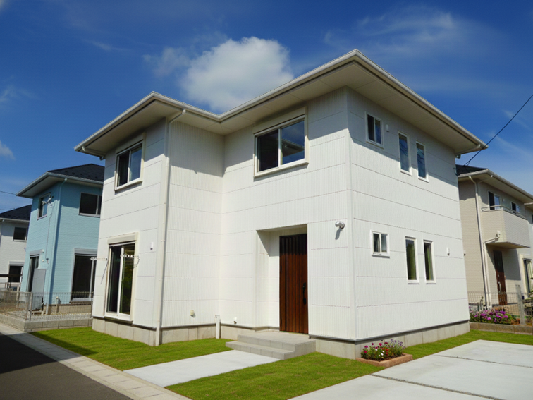 ホワイト一色の外壁色と寄棟屋根が、すっきりと洗練された印象の外観です。