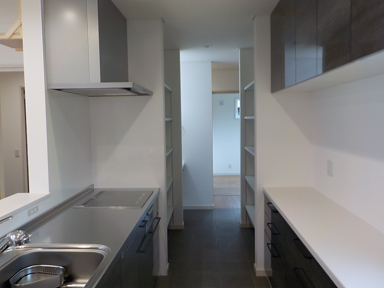 キッチンからパントリー、洗面所へとつながるスムーズな家事動線が、毎日の家事を楽にしてくれる、奥様に優しい設計です。