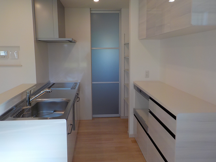 キッチンの奥の扉を開けると、シューズインクローク、玄関へとつながる回遊動線で、家事効率を高めます。