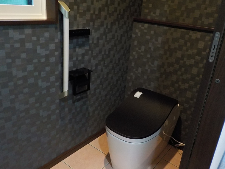 蓋をブラックにしたタンクレストイレとシックなクロスが、落ち着いたモダンな空間を演出します。