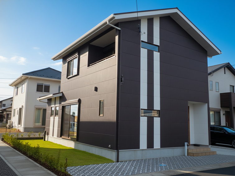パープルブラウンの外壁色にホワイトのラインがアクセントになった、スタイリッシュな外観です。