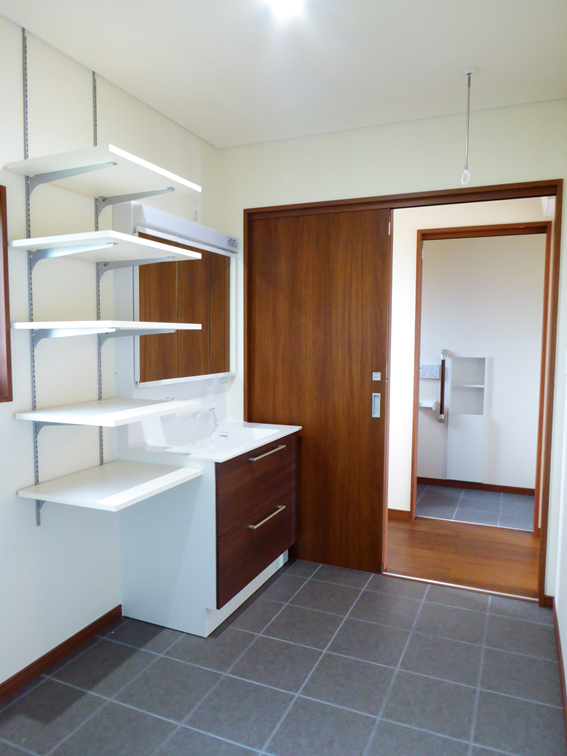 通常より広めに設計した洗面所には、可動棚と物干し金物を設置しました。
