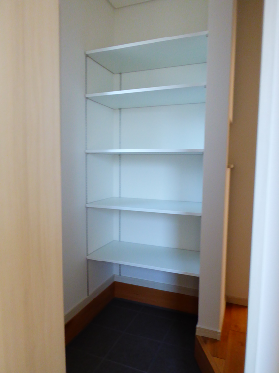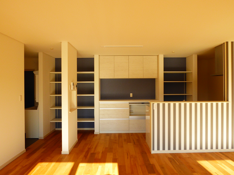 キッチン背面には、収納力抜群のカップボードと可動棚を設置しました。
