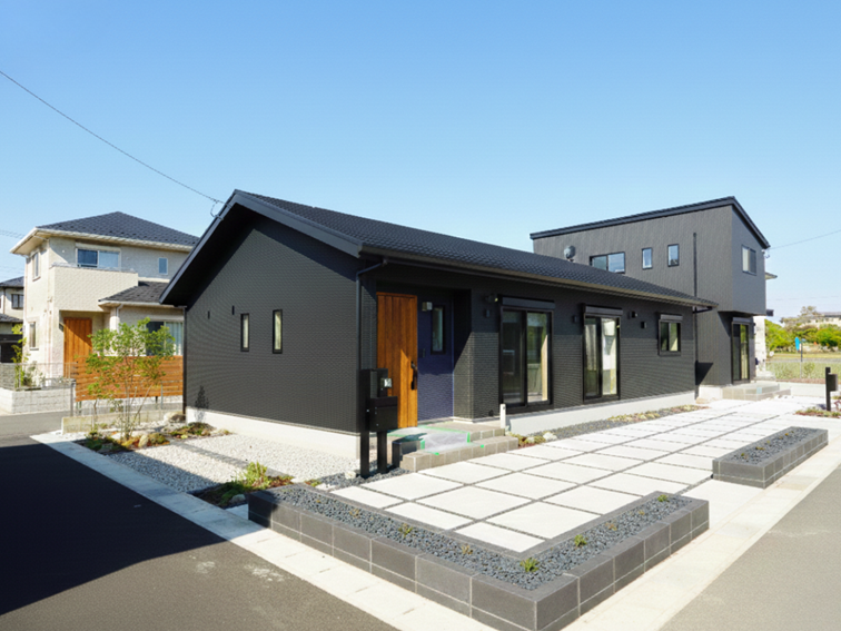 ブラックの外壁色とサッシで統一されたシャープな印象のファサードに、玄関周りのダークブルーがアクセントになっています。