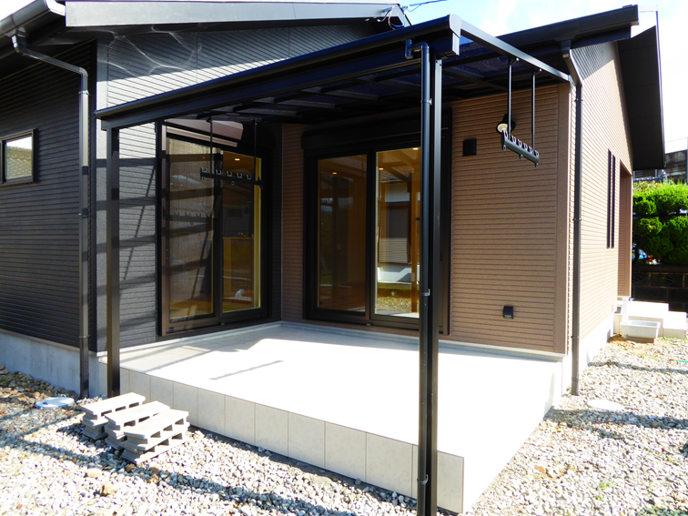 リビングと和室の前に広がる屋根付きのテラスは、天候を気にせずくつろげるプライベートな空間です。