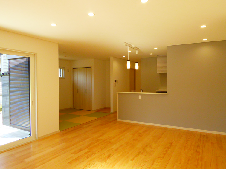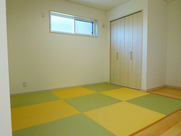 リビングに隣接した和室は、グリーンとベージュの琉球畳がモダンな雰囲気を醸し出しています。