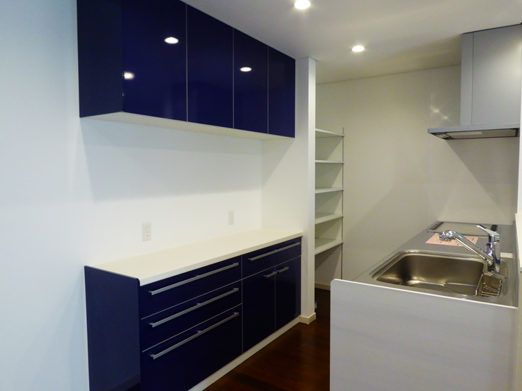 キッチン背面には、収納力抜群のカップボードと可動棚を設置しました。