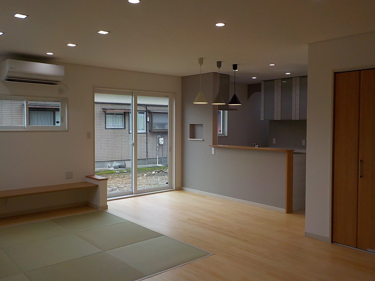 タタミコーナーが一体となった開放感あふれるLDKが魅力の平屋の住まい