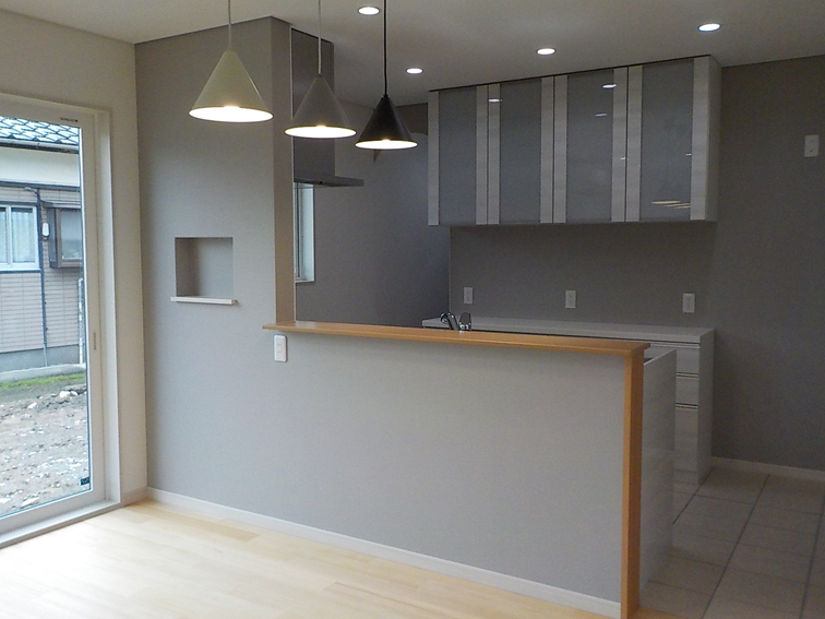 キッチンの前、対面カウンターの立ち上がり部分(壁)にはニッチを設けました。