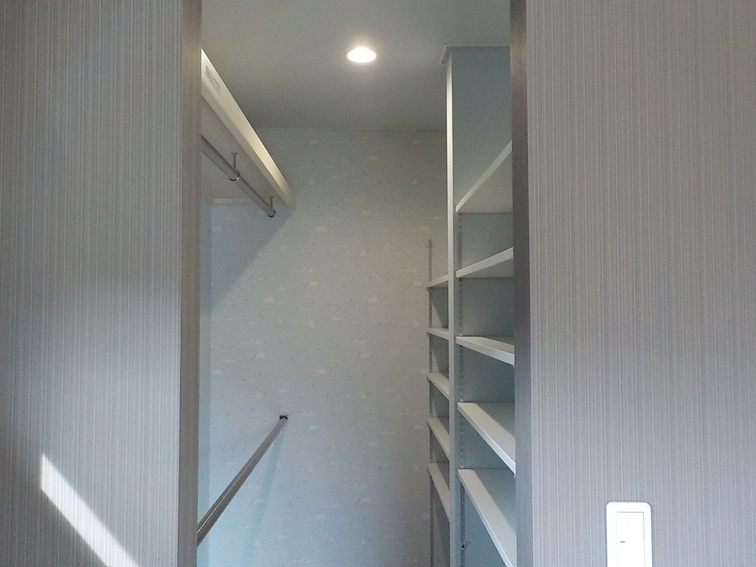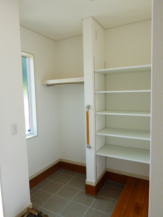 玄関横に設けられたシューズインクロークには、靴の収納に便利な可動棚と、上着やレインコートをかけられるハンガーラックを設置。