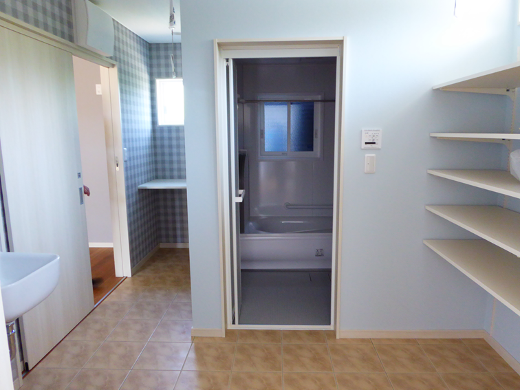広々とした脱衣所には、タオルや着替えの収納に便利な可動棚を設置。