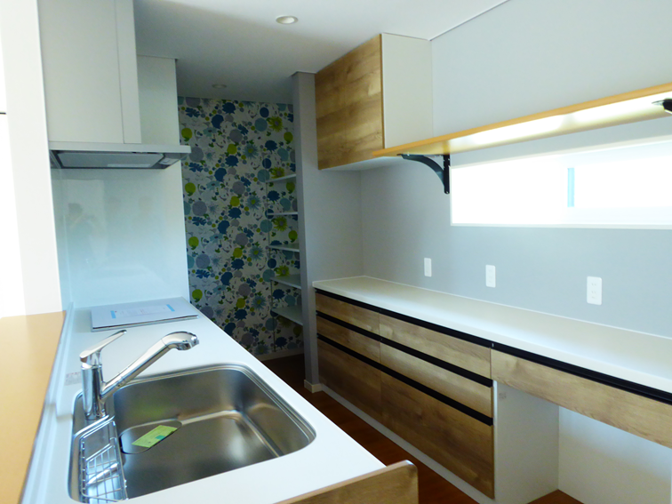 奥のカウンターは、洗濯物を畳んだりアイロンをかけたりできる家事スペースとして活用できます。