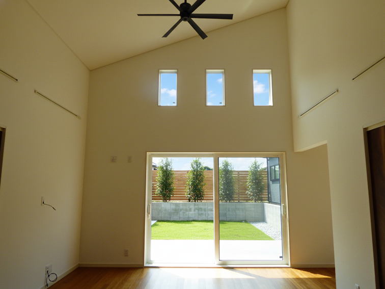 大きな掃き出し窓と、高窓である3つのFIX窓からたっぷりと陽の光が降り注ぎ、明るく心地よい家族の集いの場を実現しています。