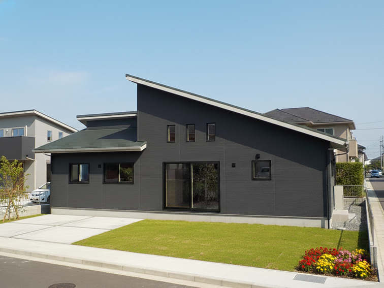 シャープなブラック系一色で統一された外壁色に、ブラックのサッシを合わせ、クールでモダンな印象の外観です。