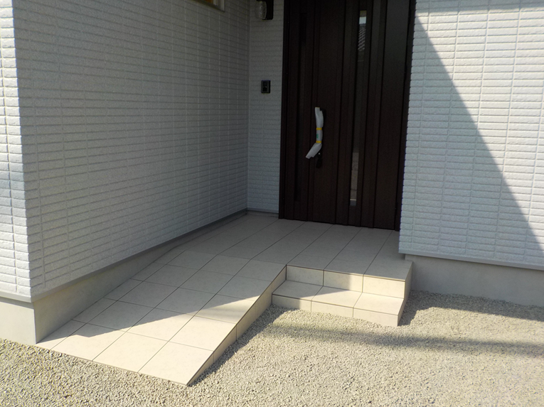 ポーチは、半分を階段に、半分をスロープにと、将来を見据えたバリアフリー設計を採用しています。