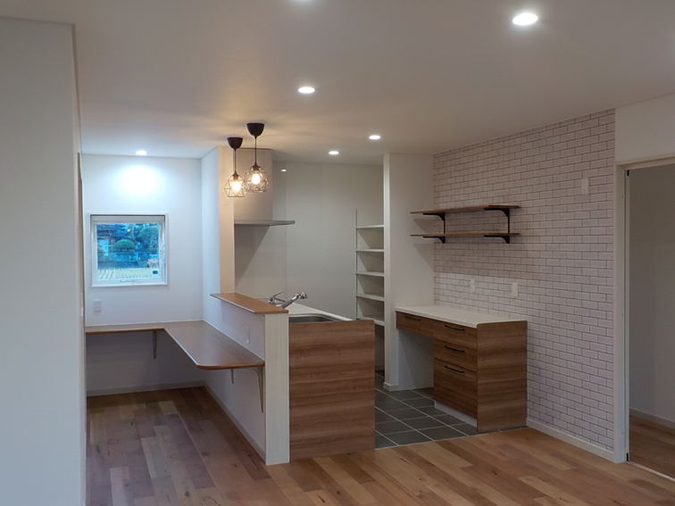 キッチンカウンターの前には、軽食や作業に便利なL字型のカウンターを造作。