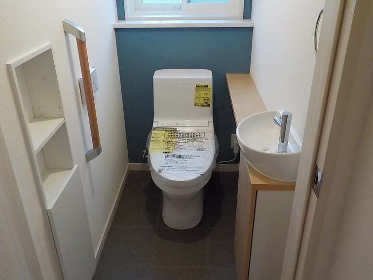 トイレには、衛生的な手洗い器と、小物やグリーンを飾れるカウンターを設置。