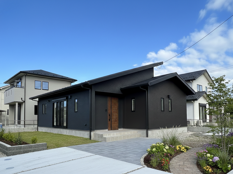 切妻屋根と片流れ屋根を組み合わせた立体的なフォルムが、モダンで洗練された印象を与えます。