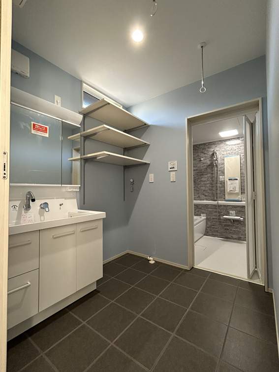 清潔感のある洗面脱衣所には、洗濯機置き場の上に可動棚を設置。