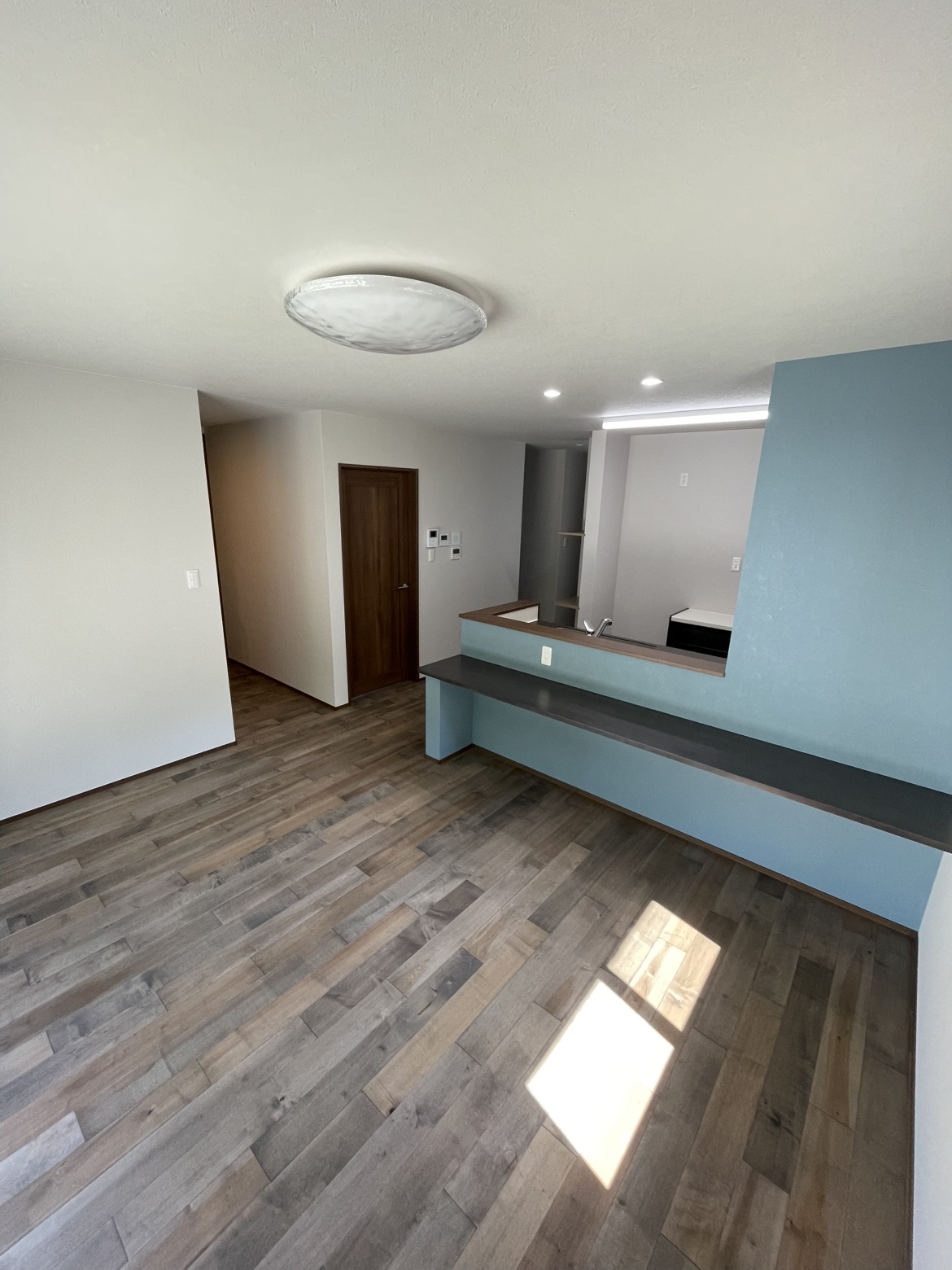 キッチンの青い壁がアクセントとして空間を引き締め、