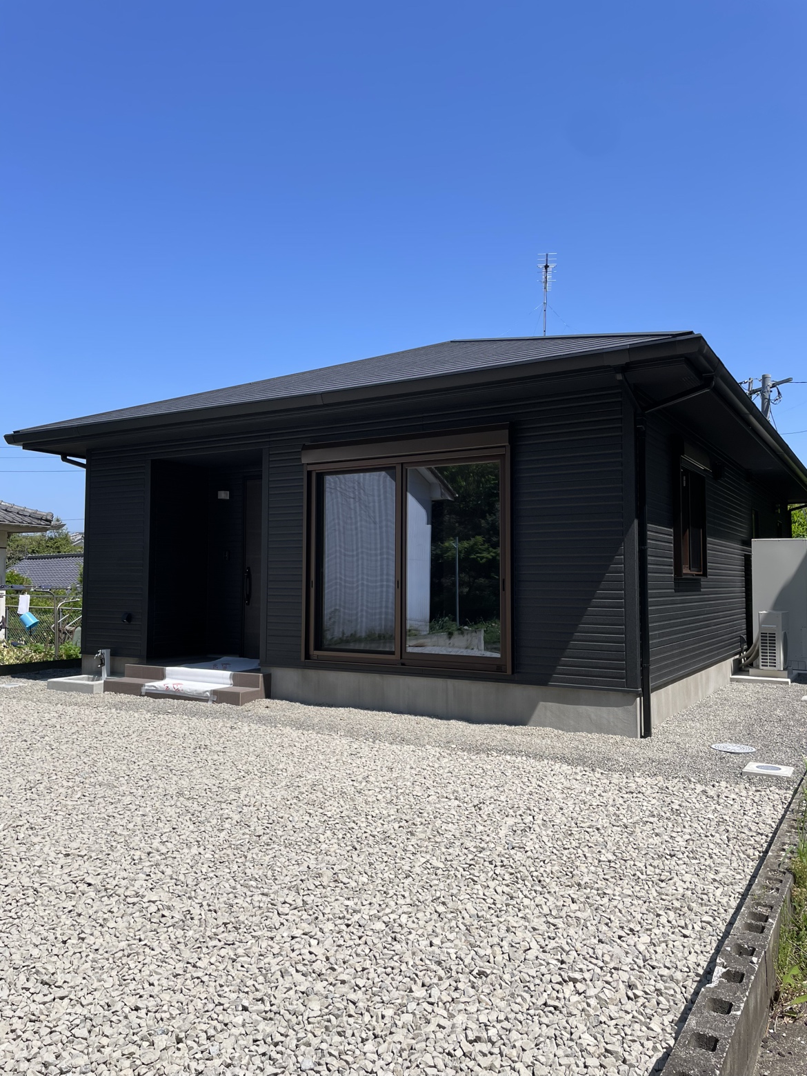 黒い外壁が青空にくっきり映えて、