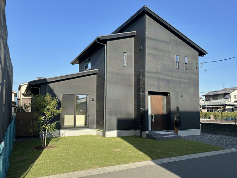 黒のシャープな外壁に段違いの屋根が個性を放つ、スタイリッシュな外観。