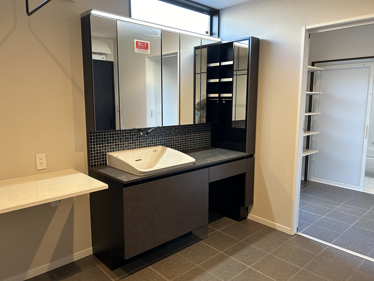 ホテルのような広々とした空間に、重厚感のある洗面化粧台を設置。