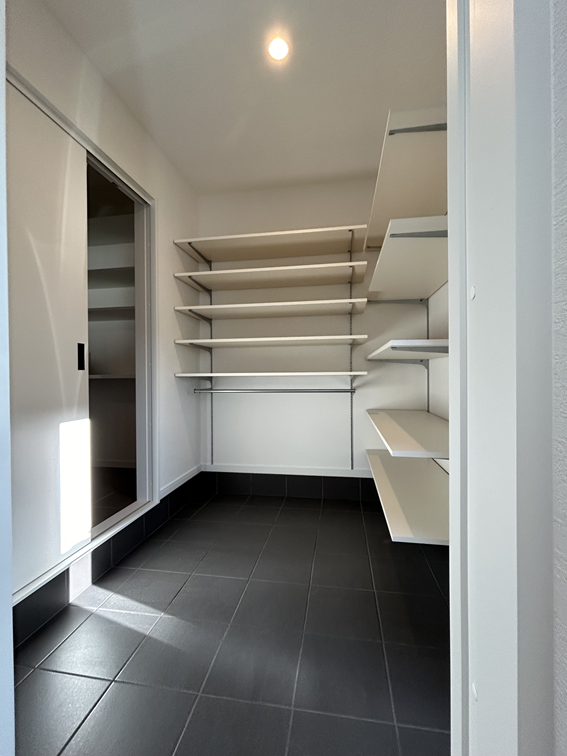 また、奥にはパントリーを設け、食品や日用品のストックを効率よく収納できるなど、充実した収納計画で、すっきりとした暮らしを実現しました。