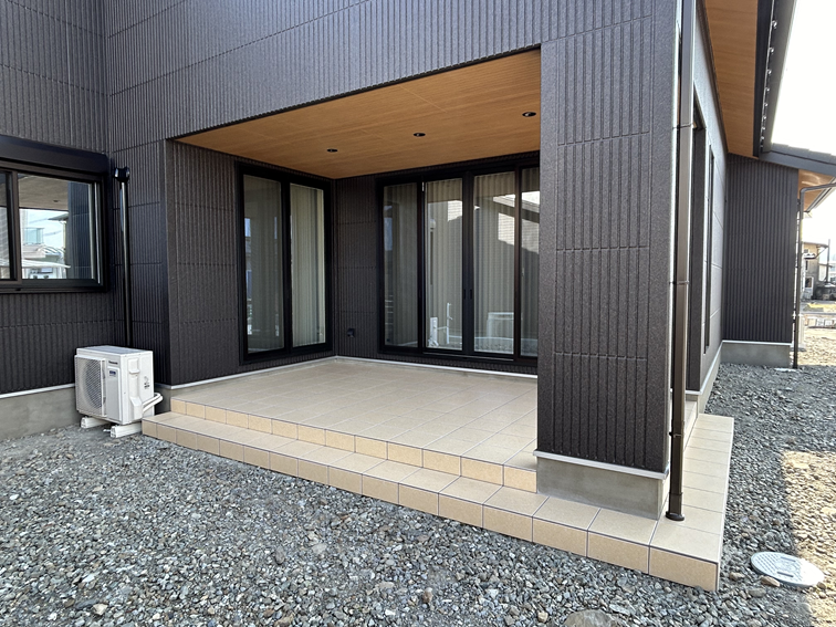広さ13㎡のタイルテラスは、リビングから続く 開放的な空間。