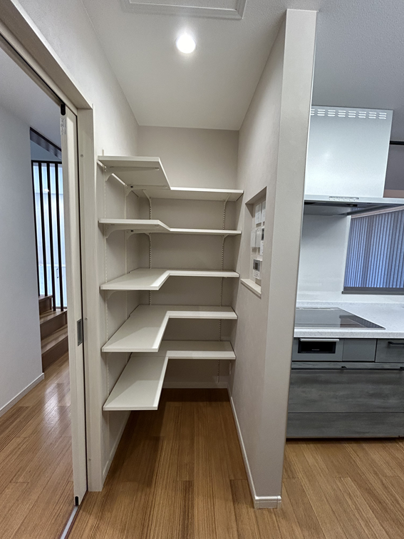 キッチン横に設けたパントリーは、食品やストック品の収納に活躍します。