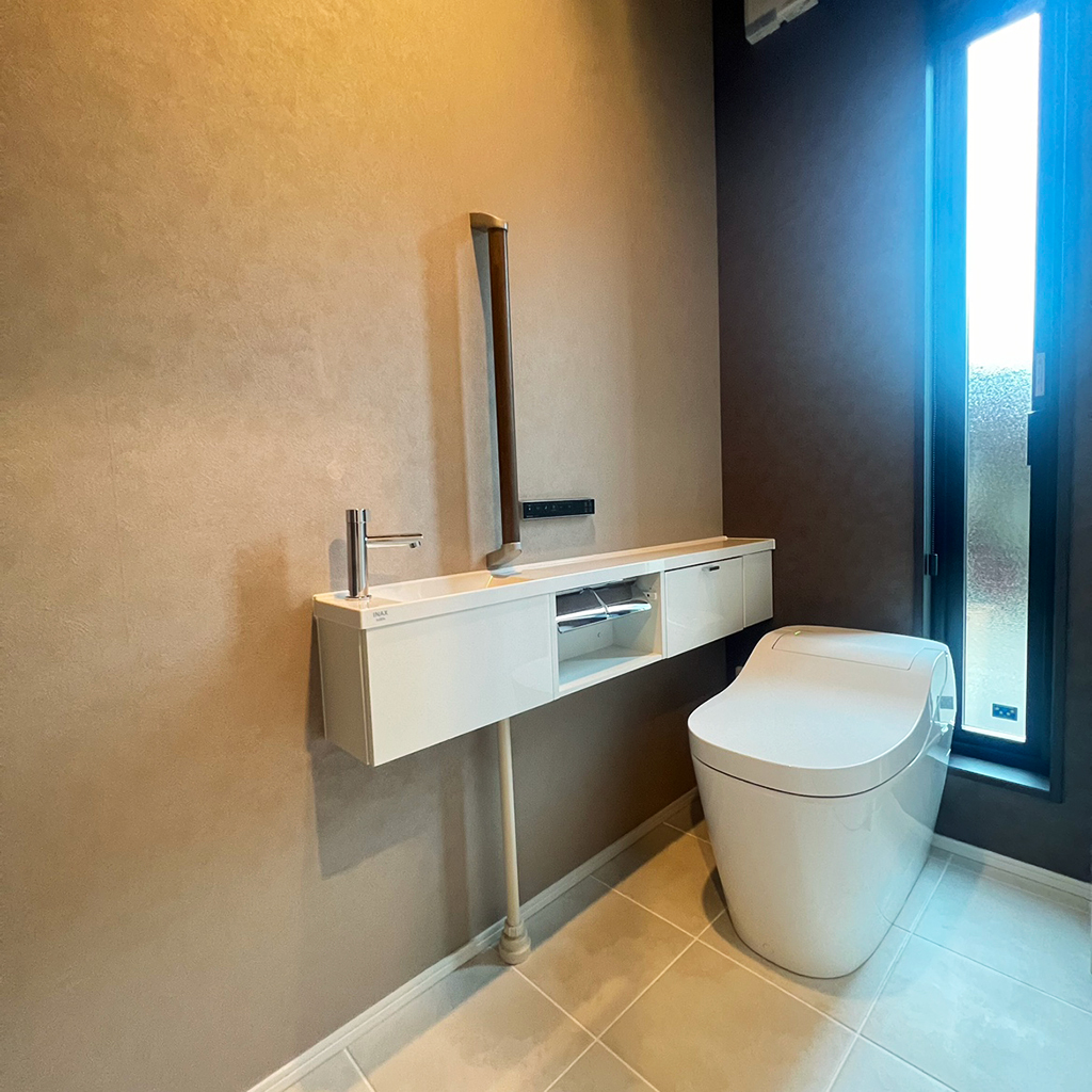 トイレはタンクレストイレを採用しました。キャビネットも大きく収納たっぷりです。