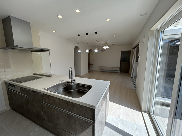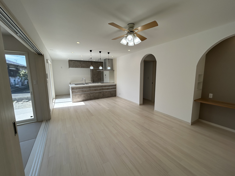 アーチ壁が空間を緩やかに仕切り、自然光あふれる 心地よい 16.9帖のLDK。