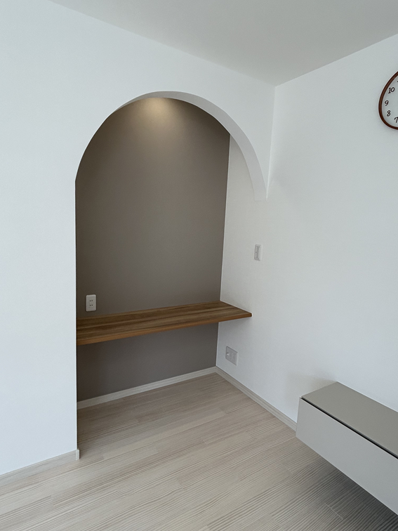 リビングの一角には、柔らかな印象のアーチ壁とカウンターを設置しました。
