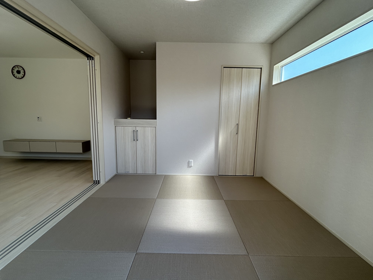 隣接するリビングとの一体感を保ちつつ、小上がり収納やクローゼットを備えることで、多目的な用途に対応するモダンな和室です。