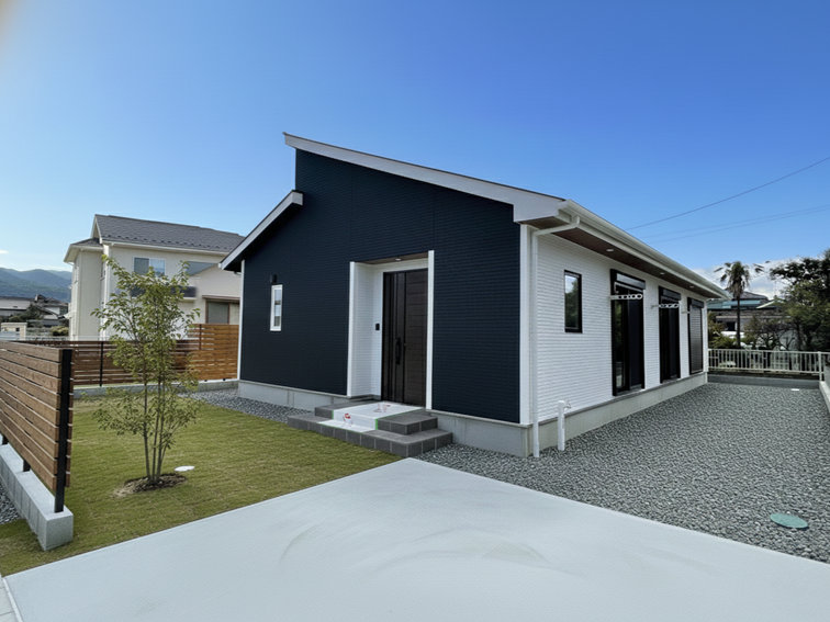 黒の外壁色と、スクエアな窓の配置が印象的なシャープな外観です。