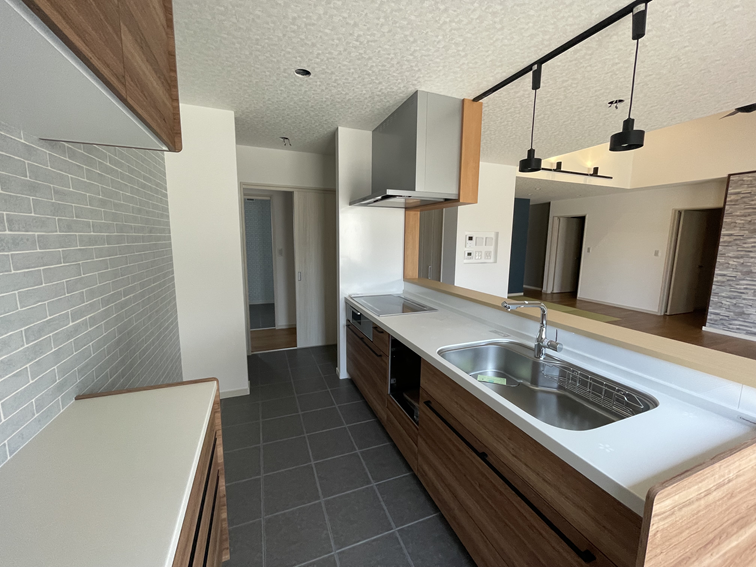 水や油汚れに強いタイル張りの床を採用し、お手入れも簡単です。