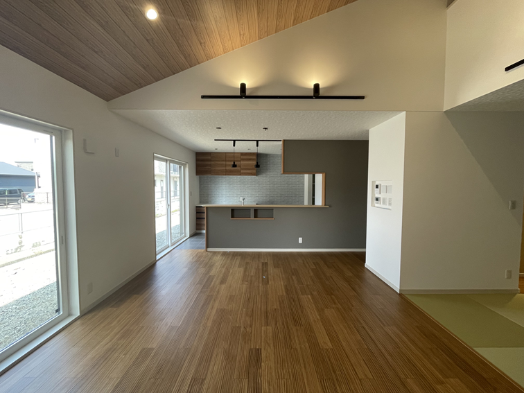 リビングの一部を勾配天井にすることで、縦の空間が広がり、明るさと開放感あふれる空間になりました。