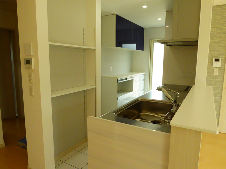 カップボードの横には2段の可動棚を設け、食器や食品を機能的に収納できます。