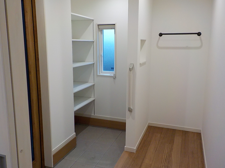 玄関には、シューズインクロークとコート掛けスペースを設けました。