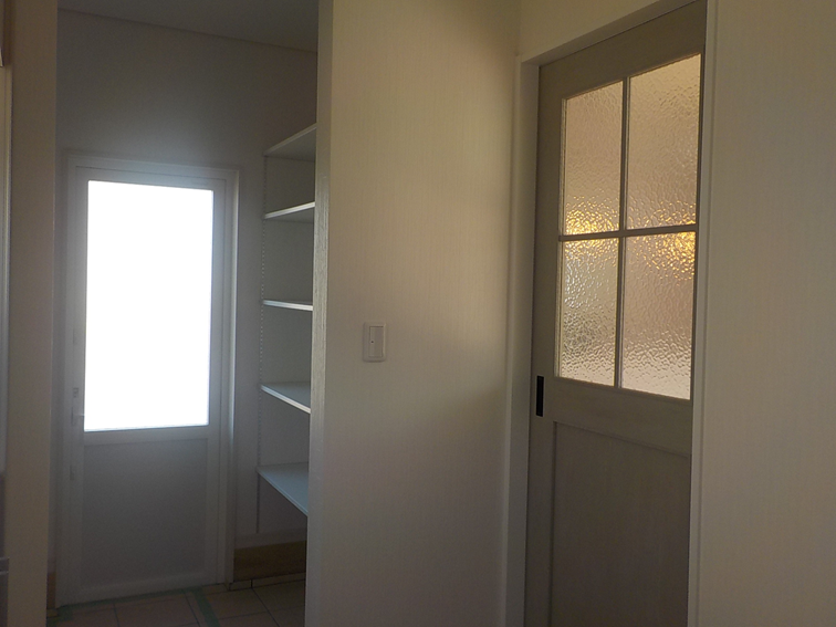 奥には勝手口ドアを設けており、荷物の運び入れなどにも便利で、日常の使い勝手を高めています。