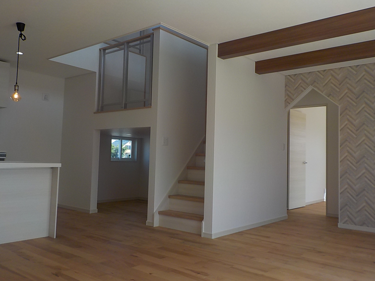 リビングには、空間のアクセントとなる化粧梁を設け、木のぬくもりを感じるお洒落な雰囲気を演出しています。