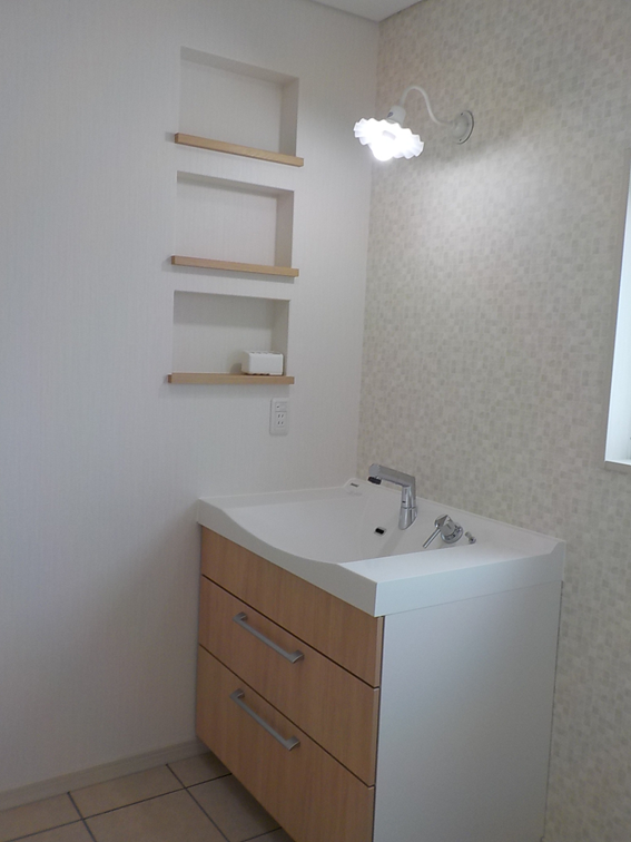 洗面所は、洗面台横の壁に、小物やグリーンなどを飾れる3段のニッチ(飾り棚)を設置。
