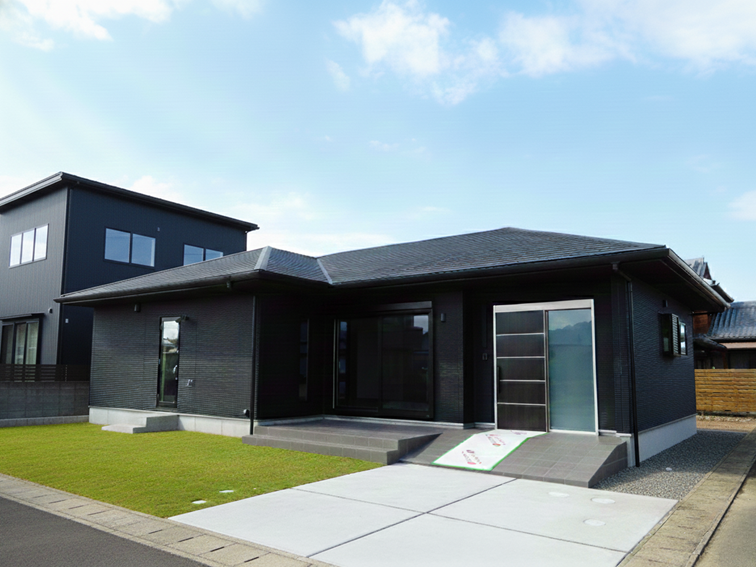 ブラック外壁色と重厚感のある寄棟屋根が、シャープでモダンな印象を与える外観です。